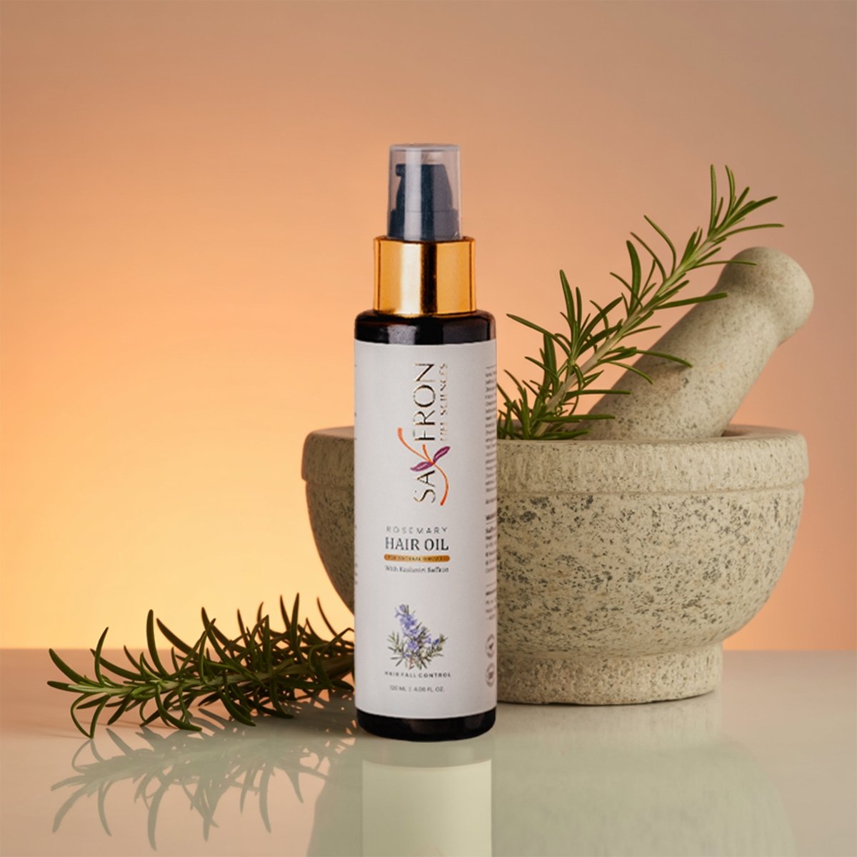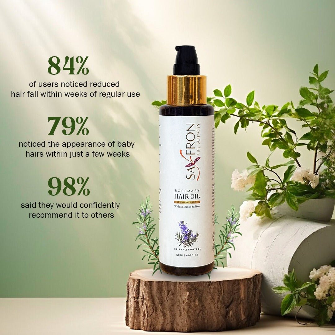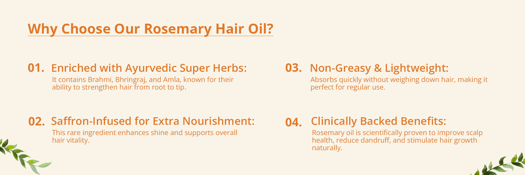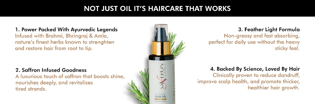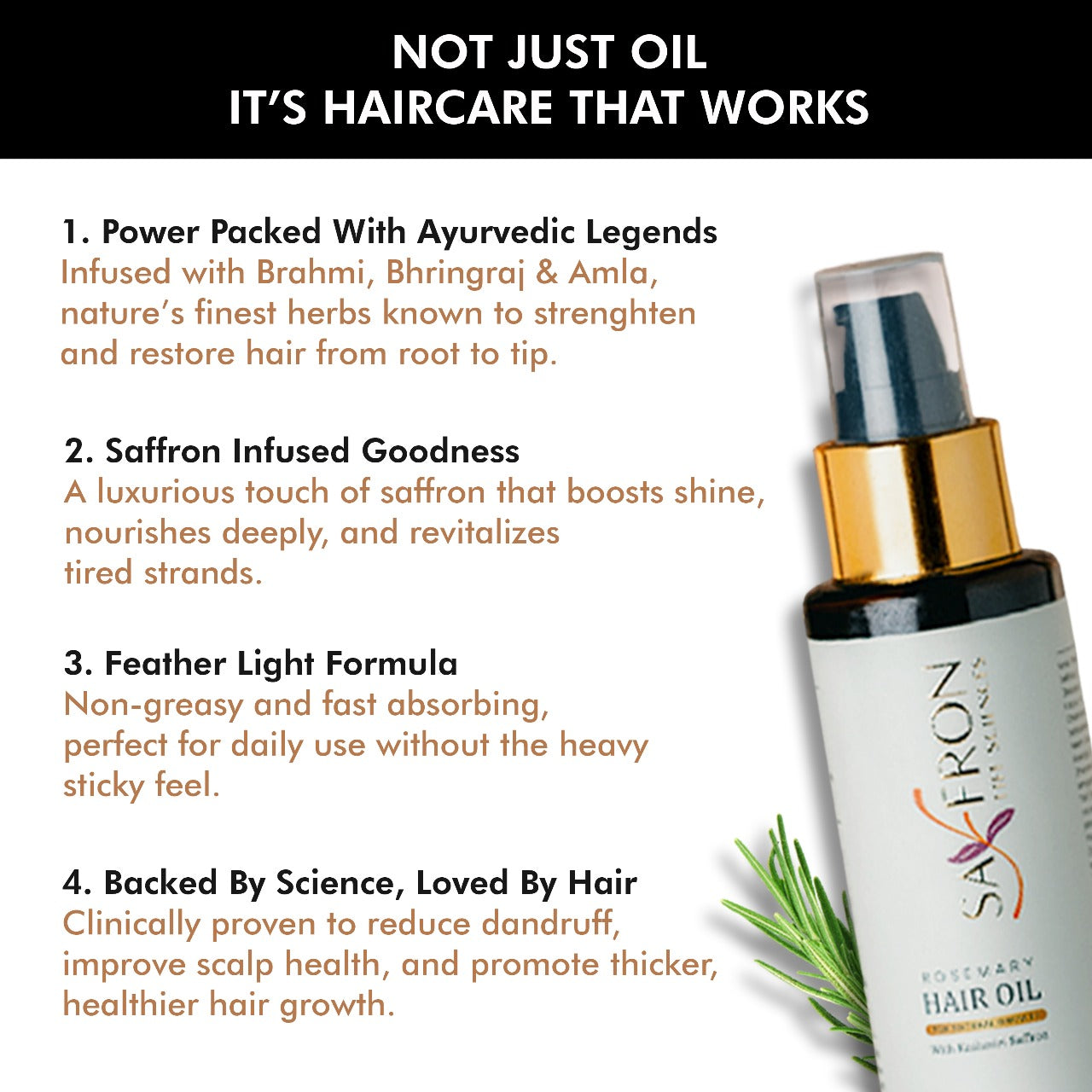 Our Rosemary Hair Oil combines rosemary with Ayurvedic herbs like Brahmi, Bhringraj, and Amla to strengthen hair, reduce hair fall, and promote healthy growth. Infused with the power of saffron, this result-oriented formula nourishes the scalp, combats dandruff, and revitalizes hair from root to tip. It leaves your hair soft, shiny, and healthy, making it ideal for daily use to reduce hair fall and improve overall hair health..