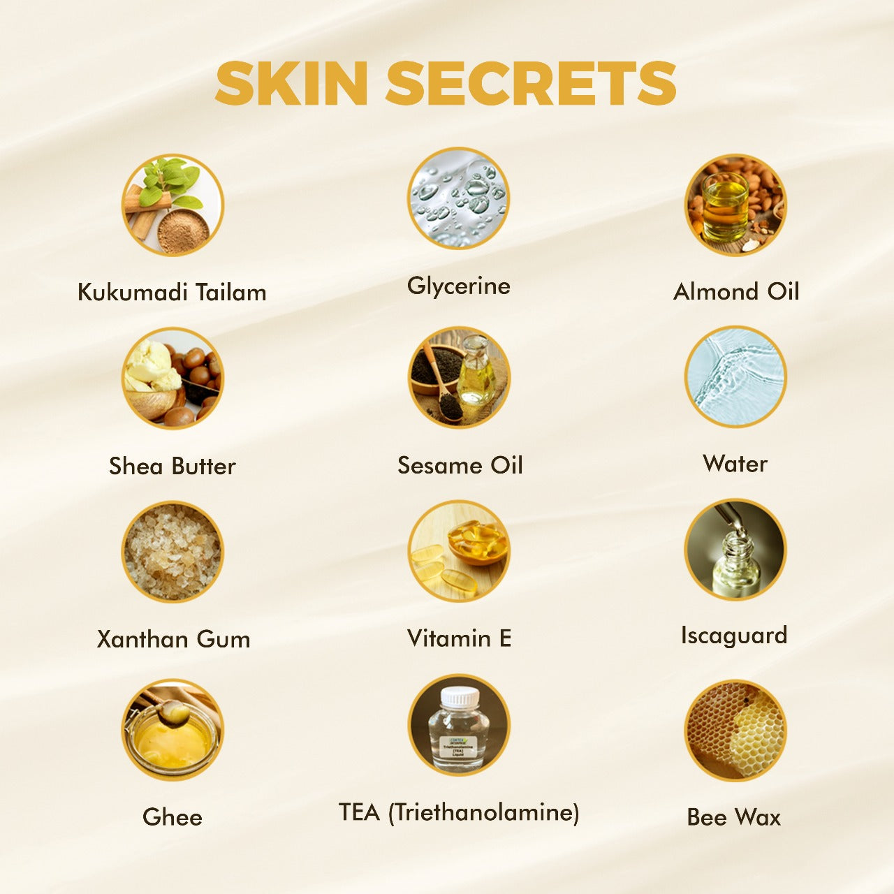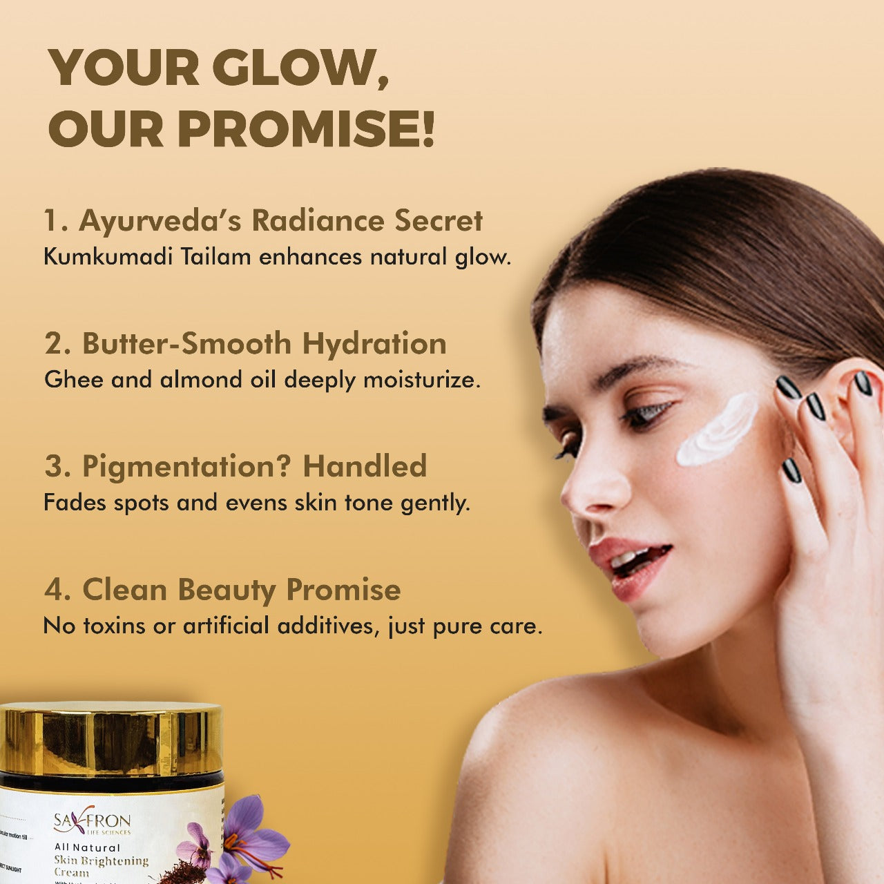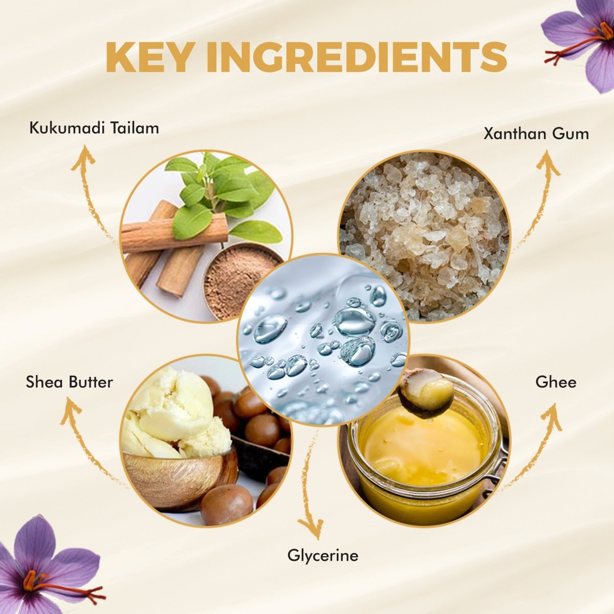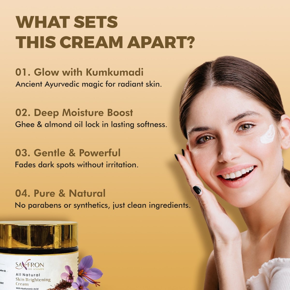 Our Skin Brightening Cream is a luxurious blend of Kumkumadi Tailam, almond oil, and ghee, designed to brighten and nourish your skin. Packed with natural ingredients like sesame oil, vitamin E, and shea butter, it hydrates, rejuvenates, and leaves your skin with a glowing, youthful radiance. Result-oriented, all-natural, and free from harmful chemicals, it’s the effective solution your skin deserves.